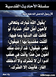 <-> عن أنسٍ رضي اللهُ عنه قال : سمِعْتُ رسولَ اللهِ صلى الله عليه وسلم يقول:"قال اللهُ تعالى: يا ابنَ آدَمَ، إنَّكَ ما دَعَوْتَني ورجَوْتَني غَفَرْتُ لَكَ على ما كانَ مِنْكَ ولا أُبالي يا ابنَ آدَمَ، لَوْ بلغت ذنوبُك عَنَان السماء، ثم استغفرتني غَفَرْتُ لكَ يا ابن آدَمَ، إنَّك لَو أَتَيْتَني بقُرَاب اْلأَرْضِ خَطَايا، ثُمَّ لَقِيَتني لا تُشْرِكُ بي شَيْئاً، لأتَيْتُكَ بقُرَابِها مَغْفِرَةً" رواه الترمذي، <->