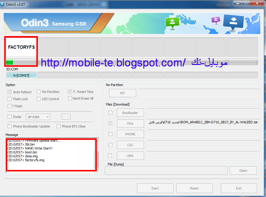 يفية تركيب روم للجالكسي عن طريق برنامج اودين بالصور خطوة بخطوة طريقة تنزيل وتركيب روم على جهاز جالكسي في هذه التدوينة سنتحدث عن تركيب الروم على أجهزة السامسونج، وسنأخذ جهاز سامسونج جالكسي اس تو اسبرنت D710 سي دي ام ايه كمثال. قبل البدء في الشرح يجدر بنا الحديث عن طرق تركيب الروم حيث يمكن تركيب الروم عن طريق الذاكرة الخارجية SD وذلك من خلال دخول وضع الريكفري وإختيار الروم المراد تنصيبه. كذلك يمكن تنصيب الروم على أجهزة سامسونج أيضا عن طريق برنامج الكيز وهو البرنامج الرسمي الخاص بسامسونج. مايهمنا وما سنتحدث عنه في هذه التدوينة هو برنامج اودين ويمكنكم تحميله عبر هذا الرابط. الخطوة الأولى : نحتاج تنزيل : 1- برنامج أودين. رابط برنامج الاودين http://www.elctronet.com/do.php?id=44 Download Odin 3.10.0 http://www.elctronet.com/do.php?id=45 =================== 2- تعاريف الجهاز ولتنزيل تعاريف أي جهاز سامسونج يمكنك زيارة الموقع الرسمي للشركة صفحة الدعم على الرابط التالي http://www.samsung.com/us/support/ وإختيار تنزيل التعاريف المناسبة بحسب جهازك في هذه التدوينة يمكن تنزيل تعاريف D710 عبر هذا الرابط. http://www.samsung.com/us/support/ow...duct/SPH-D710# ========== 3- الروم المراد تركيبه وهنا يجيب الانتباه الى تنزيل الروم المناسب سواء كان رسميا أو مطبوخا، وتحري تنزيل جميع الملفات في حال كان الروم مكون من أكثر من ملف (بوتلودر، مودم ، كيرنل وغيره). ويمكننا العثور على الروم المناسب للجهاز من خلال البحث عبر جوجل. هنا سنشير إلى رابط الروم الخاص بالجهاز الذي أخترناه كمثال وهذا الروم الرابط كالتالي http://www.mediafire.com/?15sjuj139y1w8tm هو عبارة عن الروم الرسمي للجهاز ولعدم وجود العربية فيه فقد قام الأخوة في فريق أندرويد اليمن بتعريبه وهي جهود نشكرهم عليها. ==== الخطوة الثانية : بعد التنزيل سنقوم بتثبيت التعاريف وفك الضغط عن ملفي الروم وبرنامج اودين. الخطوة الثالثة : إدخال جهاز التليفون في وضع الداونلود ويختلف تحقيق هذه الخطوة من جهاز لآخر. وفي الغالب يكون ذلك من خلال إيقاف تشغيل الجهاز تماما وبعد التأكد من ذلك نقوم بالضغط مع الاستمرار على مفتاحي التشغيل وزر خفض الصوت - حتى تظهر رسالة التأكيد الخاصة بإدخال الجهاز في وضع التحميل نترك المفاتيح ونؤكد على دخول الوضع بالضغط على مفتاح + رفع الصوت(وهذه هي حالة الجهاز موضع المثال). هذه الطريقة تنفع مع معضم اجهزة السامسونج التي ليس بها زر للهوم (الرئيسية). أما التي بها زر هوم مثل اس ثري أو فور أو غيرها يكون دخول الجهاز في وضع التحميل من خلال الضغط على مفتاح التشغيل وخفض الصوت والرئيسية. وفي بعض الأجهزة القديمة نقوم بإخراج البطارية وتركيب وصلة اليو اس بي ومن ثم فقط الضغط على زر خفض الصوت. http://3.bp.blogspot.com/-VmvmrVfTJg...710%2Bdonl.jpg الخطوة الرابعة : نقوم بفتح برنامج اودين ومن ثم توصيل الجهاز بالكمبيوتر عبر وصلة اليو اس بي وهنا سنلاحظ أن الجهاز ظهر على البرنامج حيث يظهر البرنامج عنوان المنفذ الذي يتصل به الجهاز. وستظهر في خانة الرسائل رسالة إضافة الجهاز. http://4.bp.blogspot.com/-BSn3RDVzb4...%2Brom%2B1.PNG الخطوة الخامسة : نقوم بإختيار ملف/ملفات الروم في الخانة المناسبة وفي هذا المثال سنقوم بالنقر على زر PDA في واجهة برنامج اودين كما بالصورة http://1.bp.blogspot.com/-0bUG9-aD5C...%2Brom%2B3.PNG وإختيار ملف الروم الذي سبق وقمنا بفك الضغط عنه. ننتظر قليلا حتى يقوم البرنامج من التحقق من الملف الذي تم إختياره http://4.bp.blogspot.com/-bBOYGGftzR...%2Brom%2B4.PNG وبعد ذلك ننقر على زر ستارت الموجود اسفل البرنامج. وهنا يجب التأكيد على أهمية عدم تشييك أي من الخيارات عدى تلك الموضحة بالصورة رقم واحد. بعد النقر على زر ستارت سيقوم البرنامج بتحميل الروم على الجهاز وسنلاحظ التقدم في العملية من خلال شريط التقدم الموجود في الاعلى بمحاذاة عنوان المنفذ وكذلك في شاشة الجهاز. http://2.bp.blogspot.com/-0kyWkHyZnc...%2Brom%2B5.PNG عندما يكتمل التركيب سيقوم البرنامج بإعادة تشغيل الجهاز وهنا يمكننا فصل الجهاز عن الكمبيوتر. طبعا بعد التركيب سيستغرق الجهاز فترة أطول من المعتاد حتى يعمل (في ه