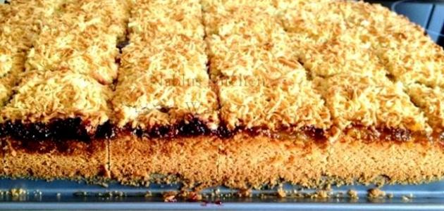 ![]() ![]() المكوّنات ثلاث بيضات كبيرة الحجم. كوب ونصف من الزيت النباتيّ. كوب ونصف من الطحين الخاصّ بالحلويّات. ملعقتان صغيرتان من الفانيلا. كوب من مربّى المشمش. ملعقتان صغيرتان من البيكينج باودر. رشّة صغيرة من الملح. كوب ونصف من السكّر العاديّ. ملعقتان صغيرتان من برش اللّيمون طريقة التحضير نخفق الزيت النباتيّ مع السكّر بواسطة الخلاط الكهربائيّ جيّداً حتّى يذوب السكّر تماماً. نُضيف برش اللّيمون ونتابع الخلط، ثمّ نبدأ بإضافة البيض بالتدريج. نُضيف الفانيلا مع متابعة الخفق. نُنخّل الطحين والباكينج باودر ورشّة الملح، والفانيلا مع بعضهم البعض، ثمّ نُضيف خليط المكوّنات الجافّة بالتدريج بحيث نضيفهم على ثلاث دفعات مع الاستمرار بالخفق. ندهن الصينيّة المراد الخَبز بها بالزيت النباتيّ، ثمّ نرشّها بالطحين ونطرق الصينيّة طرقة خفيفة كي نتخلّص من الطحين الفائض. نسكب ثلثي مقدار خليط المبروشة في الصينيّة ثمّ نفرد مقدار المربّى بهدوء على الخليط نُضيف ملعقة كبيرة من الطحين على الثلث المتبقي من العجينة بحيث تصبح متماسكة، ثمّ نبرشها على سطح طبقة المربّى بواسطة المبرشة. نسخّن الفرن مسبقاً على حرارة مئة وثمانين درجة، ثمّ ندخلها إلى الفرن لنخبزها نصف ساعة تقريباً أو حتّى تنضج. نحمّر سطحها حتى يصبح بنّياً فاتحاً، ثمّ نخرجها من الفرن ونتركها كي تبرد تماماً. نقطّع مبروشة المربّى بالشكل الذي نريده، ثمّ نصفّها في صحن التقديم ونقدّمها يتبع