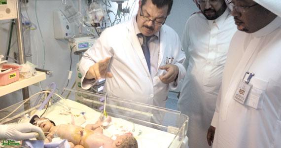 إنسانية الملك تتواصل.. «سيامي الباحة»وصل الرياض ل«الفصل» نواف عافت، عكاظ (الرياض) «إنسانية الملك تتواصل».. هذا هو لسان حال كل من يقف عند هذا الخبر والبلاد تحتفل بالذكرى السابعة لبيعة خادم الحرمين الشريفين الملك عبدالله بن عبدالعزيز ملكا على البلاد والقلوب معا. فقد وصل إلى مطار قاعدة الرياض الجوية أمس الأول التوأمان السياميان السعوديان قادما من منطقة الباحة بطائرة الإخلاء الطبي، إنفاذا لتوجيهات الملك المفدى. وفور وصول التوأمان إلى مدينة الملك عبدالعزيز الطبية للحرس الوطني كان الفريق المختص بعمليات فصل التوائم السيامية برئاسة وزير الصحة الدكتور عبدالله بن عبدالعزيز الربيعة باستقبالهم، حيث نقل التوأمان إلى جناح العناية المركزة لحديثي الولادة وأجريت لهما بعض الفحوصات الأولية. وأوضح وزير الصحة أنه بعد الفحص المبدئي للتوأم تبين أن الالتصاق في منطقة البطن والحوض والأمعاء وكذلك الأعضاء البولية والتناسلية، مبينا أن هناك حاجة لإجراء المزيد من الفحوصات الطبية الدقيقة خلال الثلاثة الأسابيع المقبلة للتأكد من عمق الالتصاق. وثمن وزير الصحة رئيس الفريق الطبي والجراحي في عمليات فصل التوائم السيامية الدكتور عبدالله الربيعة هذه اللفتة الأبوية الحانية من خادم الحرمين الشريفين وتوجيهه الكريم بنقل التوأمين وإجراء كل ما يلزم، بما في ذلك بحث إمكانية إجراء عملية الفصل للتوأم، التي تأتي في سياق مواقف خادم الحرمين الشريفين الإنسانية التي اعتدنا عليها منه أيده الله. من جانبه عبر المدير العام التنفيذي للشؤون الصحية للحرس الوطني الدكتور بندر بن عبدالمحسن القناوي عن تقديره وامتنانه لخادم الحرمين الشريفين على مبادرته الكريمة وتوجيهه بنقل التوأمين السعوديين من منطقة الباحة إلى الرياض وإجراء الفحوصات اللازمة لهما التي تدل على اهتمامه حفظه الله بأبنائه المواطنين. المصدر: منتدى الخليج